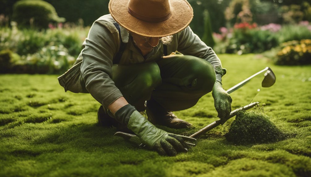 Aby skutecznie usunąć mech z trawnika, zacznij od zidentyfikowania głównych problemów, takich jak retencja wilgoci i słoneczne nasłonecznienie. Oczyść teren za pomocą grabi lub łopat, aby podnieść mech, upewniając się, że usuwasz jego korzenie. Rozważ zastosowanie herbicydów na bazie żelaza lub organicznych opcji, takich jak sole potasowe do uporczywych miejsc. Popraw drenaż poprzez aerację gleby i dodanie materii organicznej, aby poprawić zdrowie trawy. Podlewaj rzadko, ale głęboko, aby zachęcić do zakorzenienia. Zajmując się tymi problemami, stworzysz mniej sprzyjające warunki dla mchu. Jest wiele więcej, co możesz zrobić, aby zapewnić, że twój trawnik będzie bujny i wolny od mchu.
