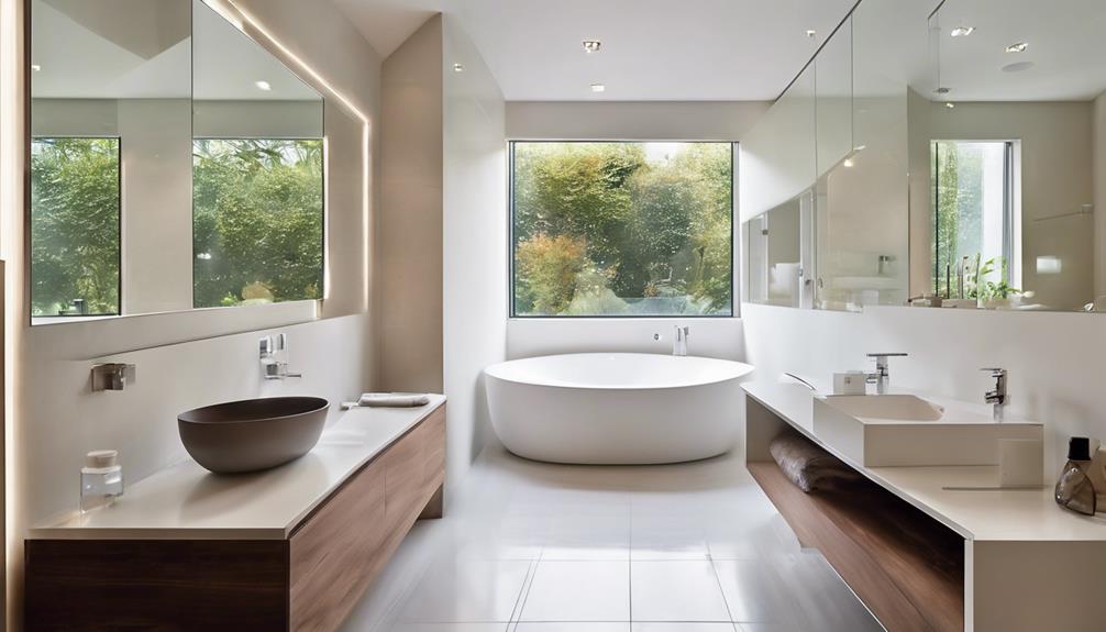 While bright light invigorates your mornings, softer lighting creates a calming evening atmosphere. Dimmer switches offer flexibility, letting you adjust brightness to suit your mood, enhancing both functionality and comfort in your bathroom experience.
