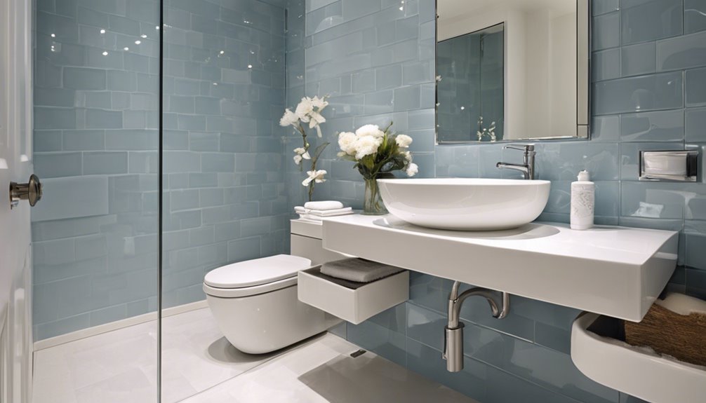 Dla małej łazienki wybierz większe płytki o wymiarach 60×120 cm, aby stworzyć iluzję przestrzeni i zredukować fugi. Jasne kolory, takie jak biel, delikatne szarości czy beże, sprawią, że Twoja przestrzeń będzie wydawać się lekka. Rozważ użycie błyszczących wykończeń, aby odbijać światło, co dodatkowo zwiększy jasność. Mieszanie tekstur, takich jak płytki odbijające światło i teksturowane, dodaje głębi, poprawiając jednocześnie bezpieczeństwo. Wybierz układy, które przyciągają wzrok ku górze, takie jak pionowe lub ukośne instalacje, aby maksymalnie zwiększyć poczucie wysokości. Jeśli zbadujesz różne opcje, odkryjesz więcej wskazówek, jak idealnie stylizować swoją małą łazienkę.